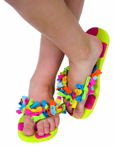 Fringy Flops. Wrap and tie multicolored fabric strips onto the straps of a pair of flip flops for a fun, personalized look. This package contains 1 pair of flip flops size 2 (fits most kids from 6-8yrs) or size 5 (fits most kids from 8-10yrs), forty-six multi-colored knit fabric strips and easy instructions. Each size is sold separately. Contents conform to ASTM F963. Recommended for children ages 6 and up. Warning: Choking Hazard-small parts. Not for children under 3 years.